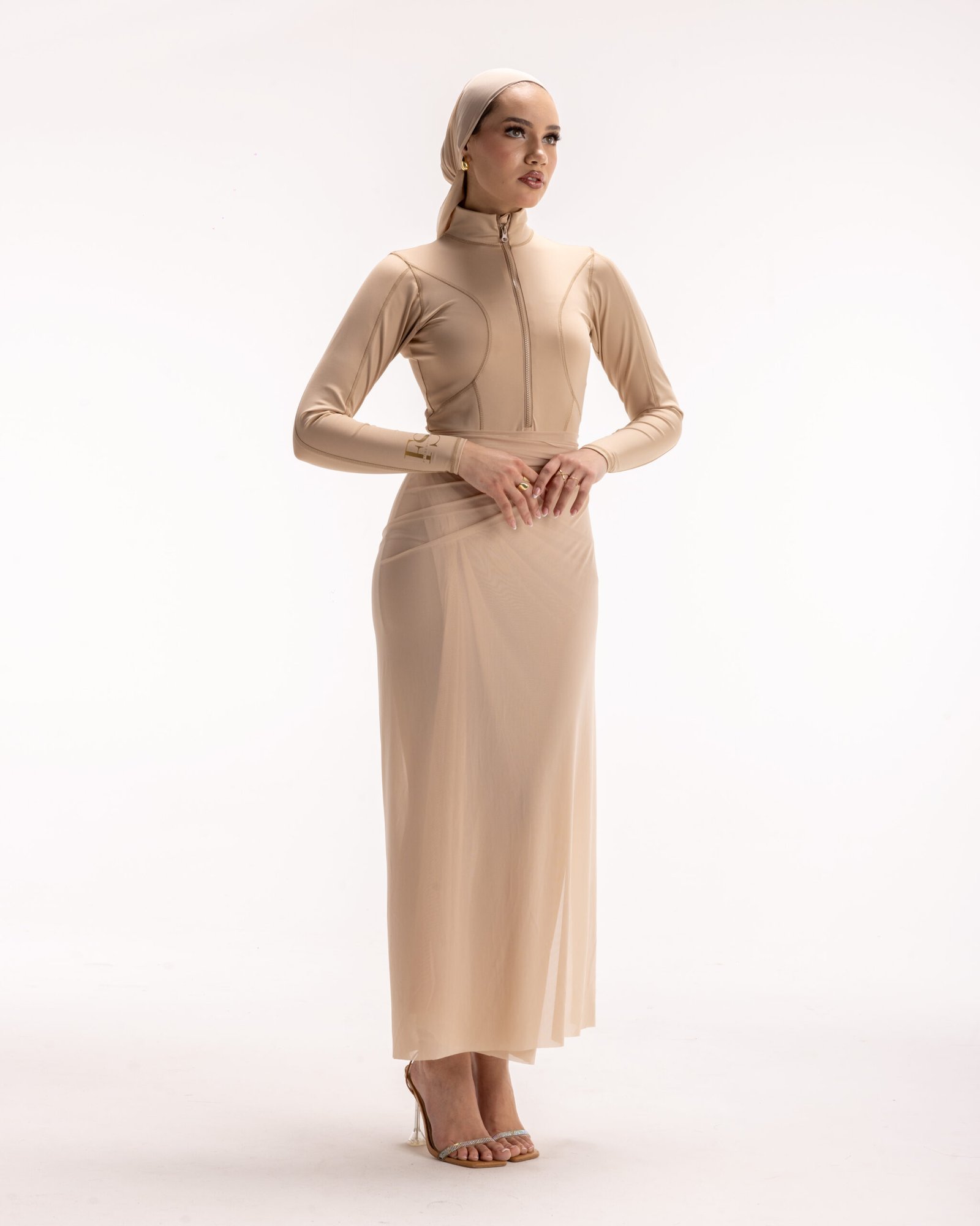 Complete your Sandy Sugar swimwear set with this elegant chiffon tulle coverup skirt in a matching sand beige tone. Featuring a stretchy waist band for a comfortable fit, the lightweight fabric drapes beautifully, adding softness, modesty, and a refined touch to your beach or poolside look.